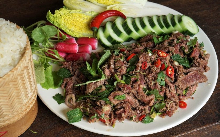 Laap (Laos): Laap, also known as larb, is a traditional Laotian dish made with minced meat (usually chicken, pork, or beef) mixed with herbs, lime juice, fish sauce, and ground toasted rice. It is often served with fresh vegetables and sticky rice.